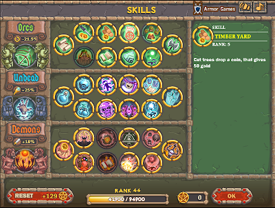 You'll spend a good amount of time in the Skills section adding points to specific skills. Skills can make upgrading towers cheaper, let you start with extra money, make bonuses more likely and all sorts of other awesome stuff. You can also change where you have points placed at any time, which comes in very handy with later levels where some skills are more vital and others might be entirely useless. If you entirely max out your rank you'll be able to entirely max out your skills too!