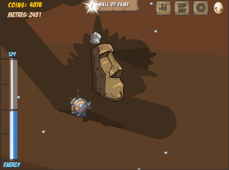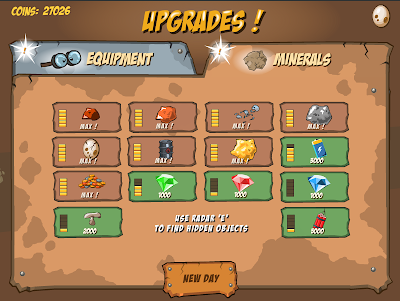 What's more, even the minerals and goodies that you find can be upgraded! I've never seen an upgrade game where you're able to do so much with the things you find as well - aside from the dynamite (which only becomes more frequent as it's upgraded), everything else becomes more valuable and more frequent as you upgrade it! Balancing upgrading your equipment with upgrading your minerals is a big part of the challenge, and on a second play through I'd definitely upgrade them sooner (I'd just assumed the tab listed what I'd found at first).