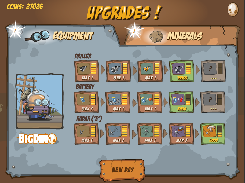 | Every upgrade has five upgrades to it. After that, you'll get a new, better version of the driller, battery or radar to upgrade. |
