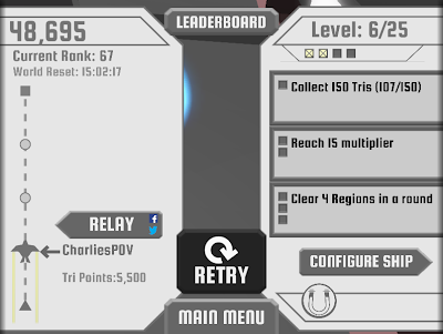When I heard Race the Sun called an infinite runner style game, I was a little leery... I'm not really a fan of games where you simply play the same area over and over, relying on memorizing when to click the jump button. Luckily, that isn't really Race the Sun. Race the Sun gives you three challenges to complete at a time; things like "score 15,000 points" or "Collect 20 Tris" (Tris are blue pyramid score pickups that you have to snag while dodging objects). More difficult challenges are worth more than one point, and each level has a set number of points to acquire before leveling up, making it easier (and possible) to make it further into the game. Once you hit Level 4, for example, you gain the ability to jump after grabbing the proper pickup, which really adds another awesome dimension into the game. These are what keep you coming back - some of these challenges take one or two tries, others are easily ten or more! Some challenges even make you play the game differently, like challenges that have you travel a certain distance in the air or hit a bunch of boosts in a single region (which means being a dangerous speed demon!).