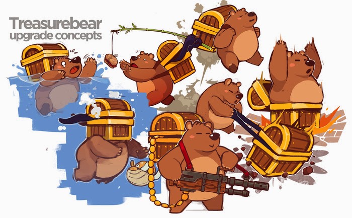 Treasurebear combines two incredibly awesome things: good platforming action and LOTS of treasure! The game focuses on a duo of unlikely "heroes" - [From the Kickstarter page] "The greedy and unpredictable Chester, a charismatic treasure chest forever condemned by the treasure hunter's guild, and his sleepy sidekick Barry, a hungry bear who prefers sauce battles over boss battles." The story is driven as such: "Barry teams up with Chester following the promise of visiting foreign lands in order to locate and sample exquisite and tasty foods. Determined to locate his blackmailer and exonerate himself, Chester utilizes his uncanny talents for finding shiny and potentially valuable items while upholding his promise to Barry."