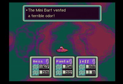 I'd been playing Earthbound before I picked up Shiren, and I think a few elements (or at least atmosphere) worked their way into Voyage to Farland as well, more subconsciously than by design. Since I started working on Voyage when I lived in Japan, there's a Japanese cultural influence also with a few of the monsters: Oba (from Obatarian - the way Japanese people describe "battalions" of pushy middle-aged women), Oni (the Japanese word for demon), and the Maskboy monster which is influenced by the bouncing heads and the masked "No-Face" character in Miyazaki's film, "Spirited Away".